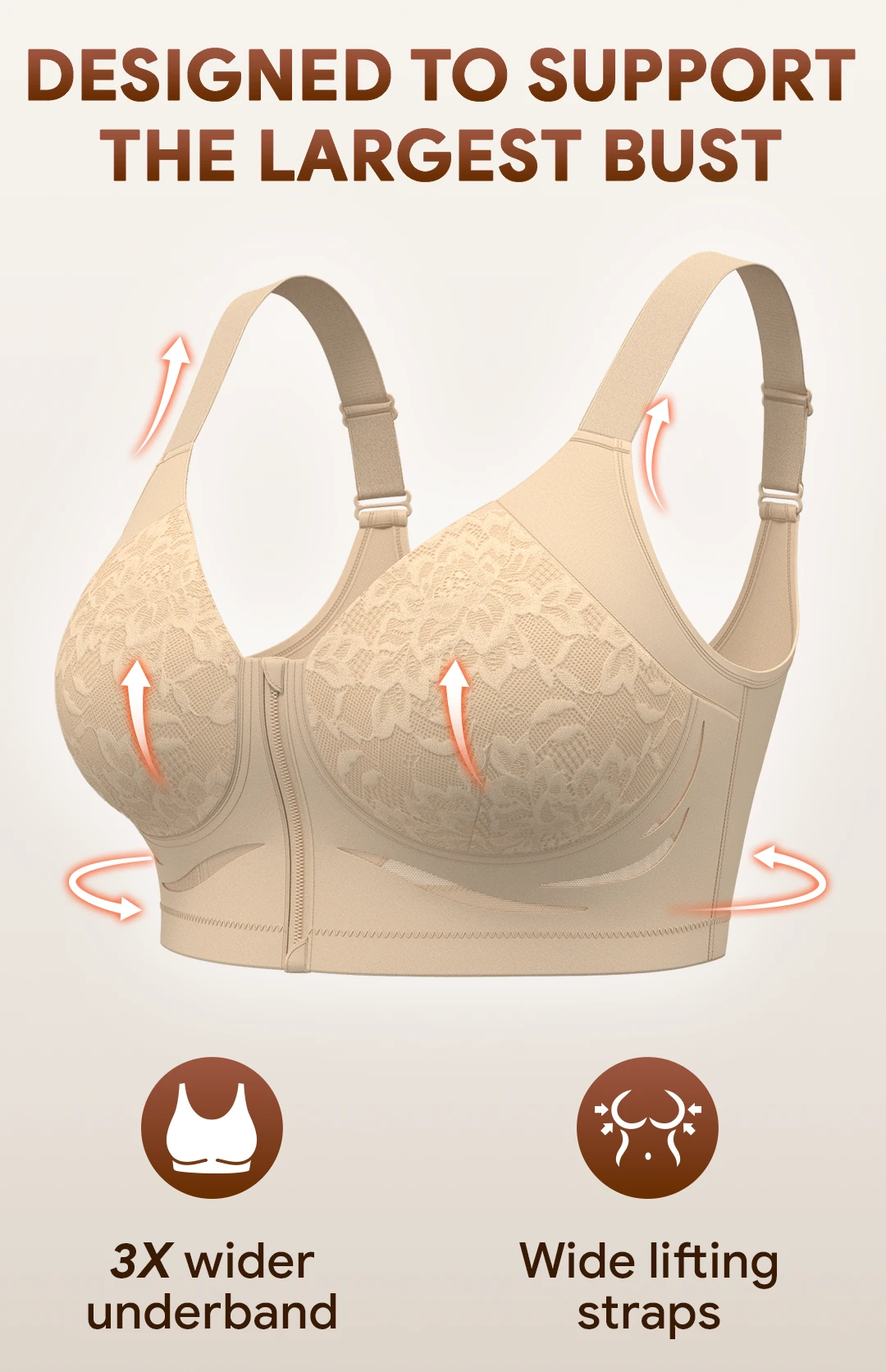 Well, this bra is seriously built to hoist and hold the girls up. I’m a 40E, and it fits really well. It stays put all day, no tugging it down or fiddling with the back. It smooths out my back and sides perfectly under a T-shirt, and the plunging neckline is spot-on for low-cut tops. I love that the straps are wider for extra comfort, especially for us bustier gals. The wide back band is exactly what I needed, regular bras always pull forward and create unflattering lumps. It’s true to size, super comfy without wires, and great for all-day wear. The only down point was that they were out of my favorite color when I ordered. Hope they'll restock soon